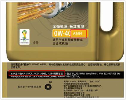 上图大家可以看到机油瓶身标红的A3/B4这一说明,他的意思是延长换油周期与运转苛刻,对于气候条件和路况不佳的车主来说,这无疑是最适合的机油。大家平时可能还能看到A1/B1、A5/B5这样一些表示,跟大家科普一下,A1/B1代表着燃油的经济型和标准的标准换油周期,A5/B5和前者相差不多,不同的是延长换油周期。这两种均相对普通,与A3/B4这种具备特殊的性能感觉还是有所不及,所以并不推荐大家使用。