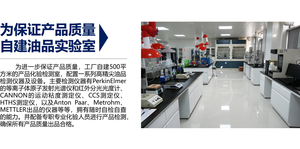 公司拥有国际标准化油品分析检验室,检测仪器采自Cannon、Metrohm、Mettler-toledo、Anton paar、Perkin Elmer等国际知名厂家。由专业的油品检验工程师按照GB、SH、ASTM、CEC等方法进行检测,确保公司经营的所有品牌润滑油产品100%达到质量标准。